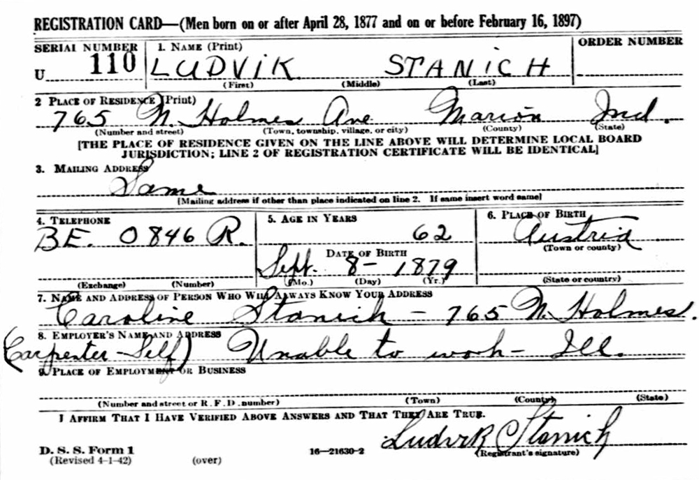 Ludvik Stanich World War II Registration Card